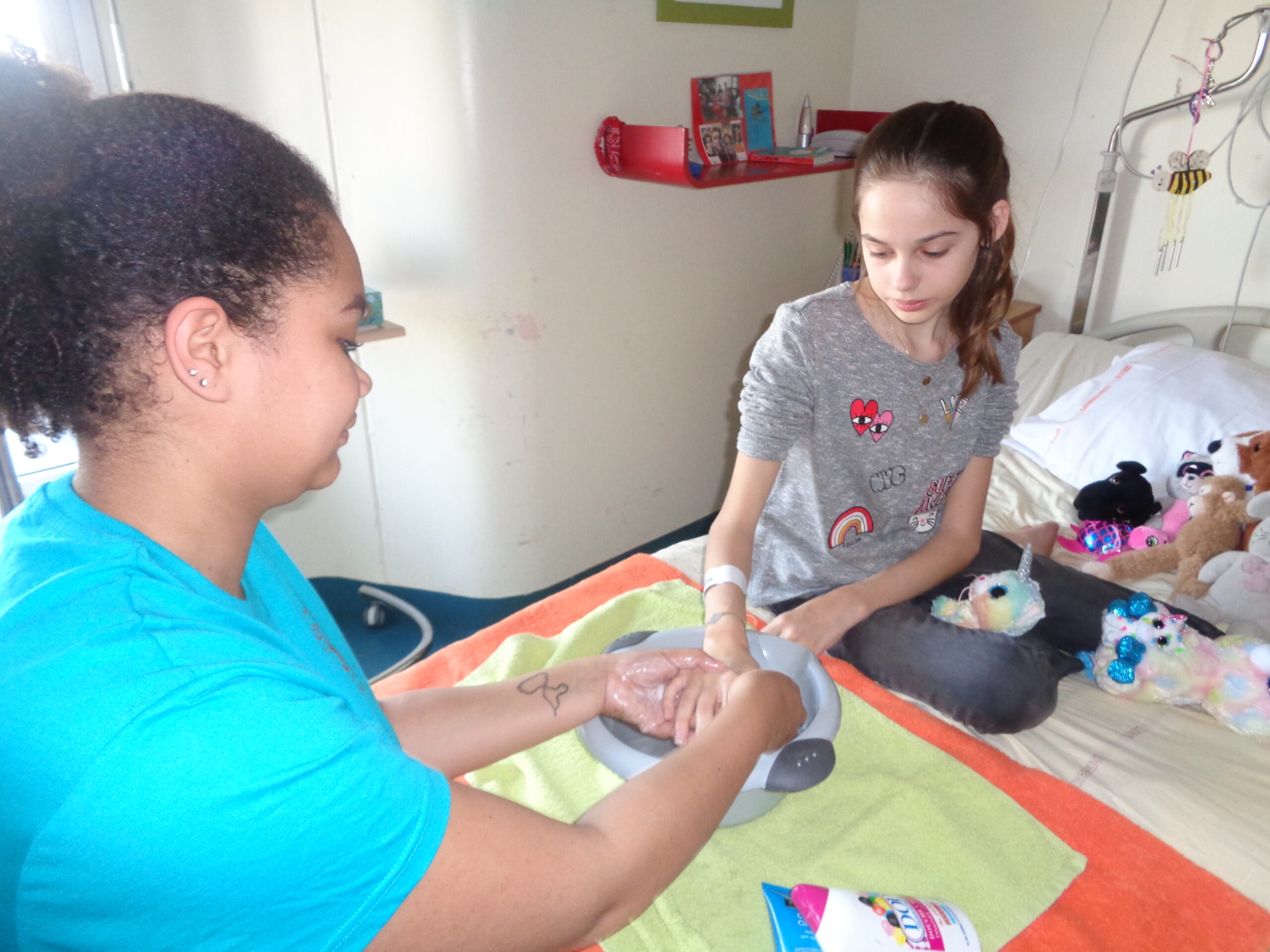 C’est en effet en proposant deux ateliers, tels que le massage des mains pour 2 adolescentes et une découverte olfactive pour 3 grands enfants, que le contact a pu s’installer, faisant place à la communication, aux échanges de sourires, à la détente, dans l’optique d’oublier pour un moment les soins.