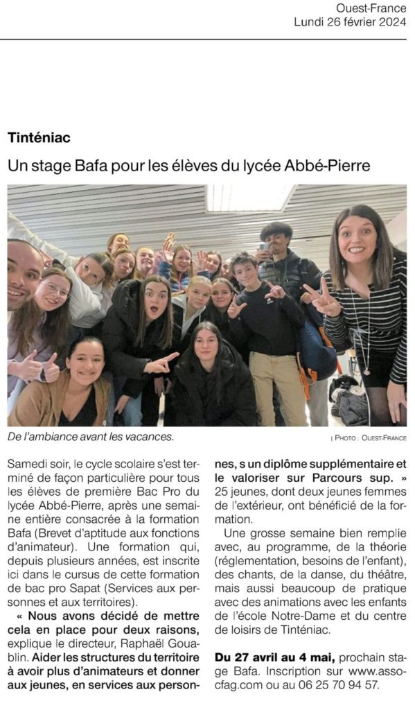 Chaque année: un stage BAFA proposé à tous les élèves en 1ère Bac Pro SAPAT
